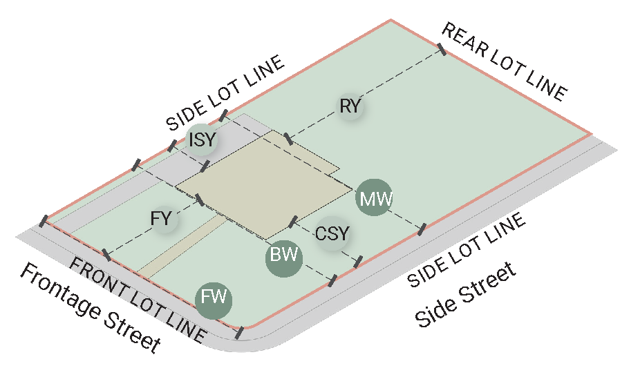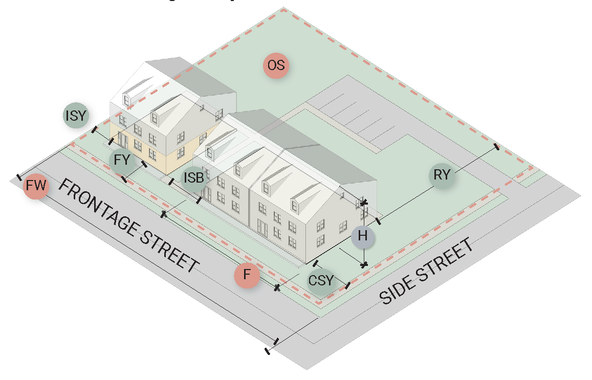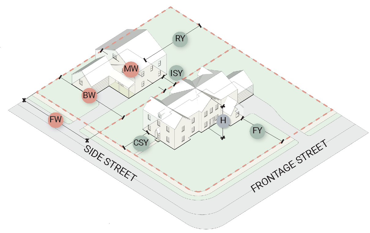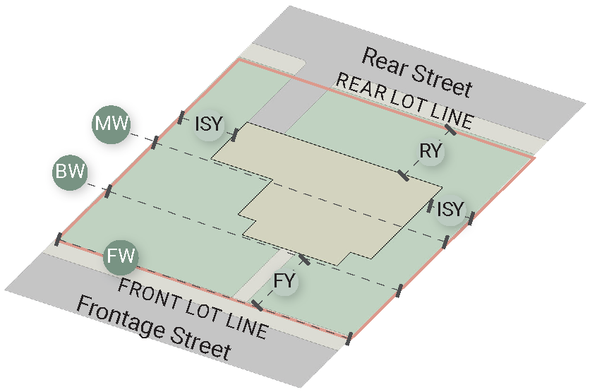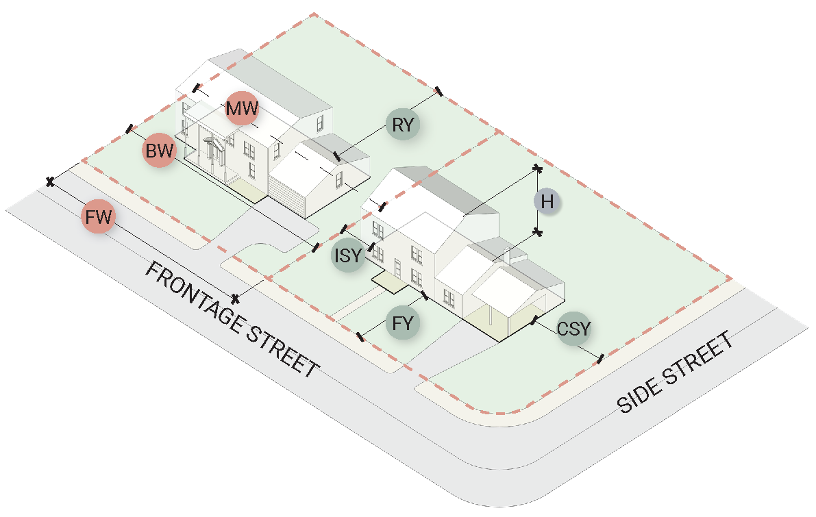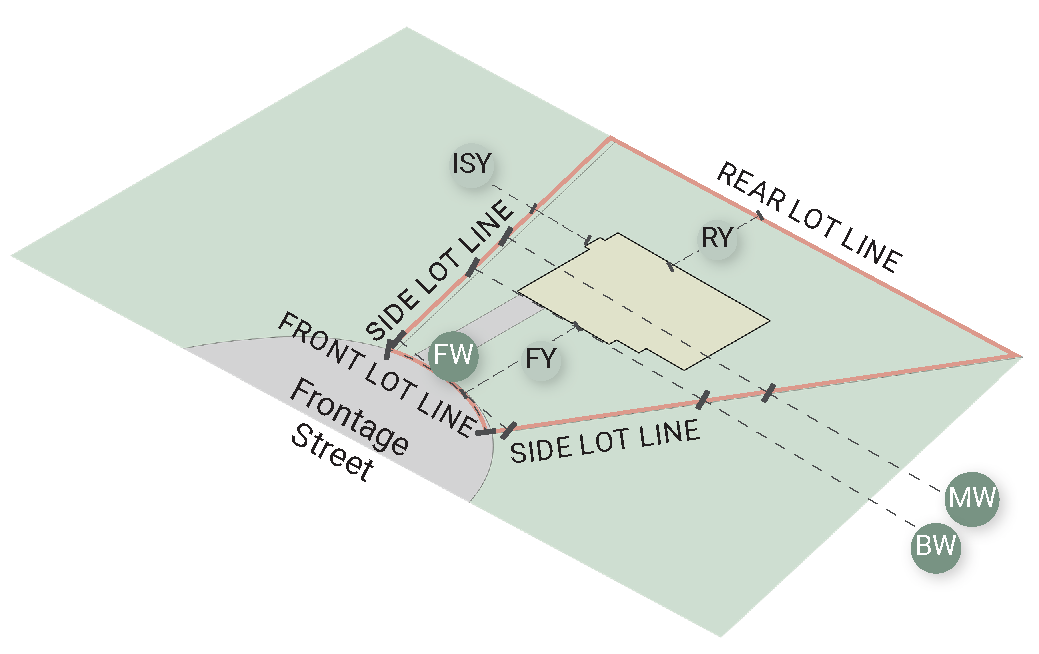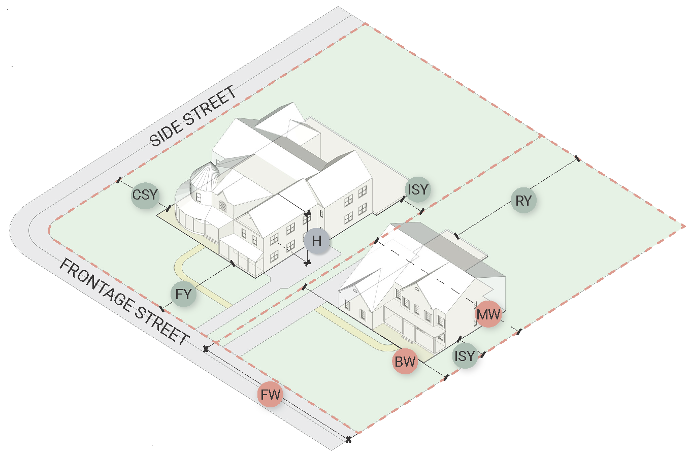 The diagrams and text below define dimensional terms and direct how to measure lot and structure dimensions. All terms are also referenced in Article 9 - Definitions.