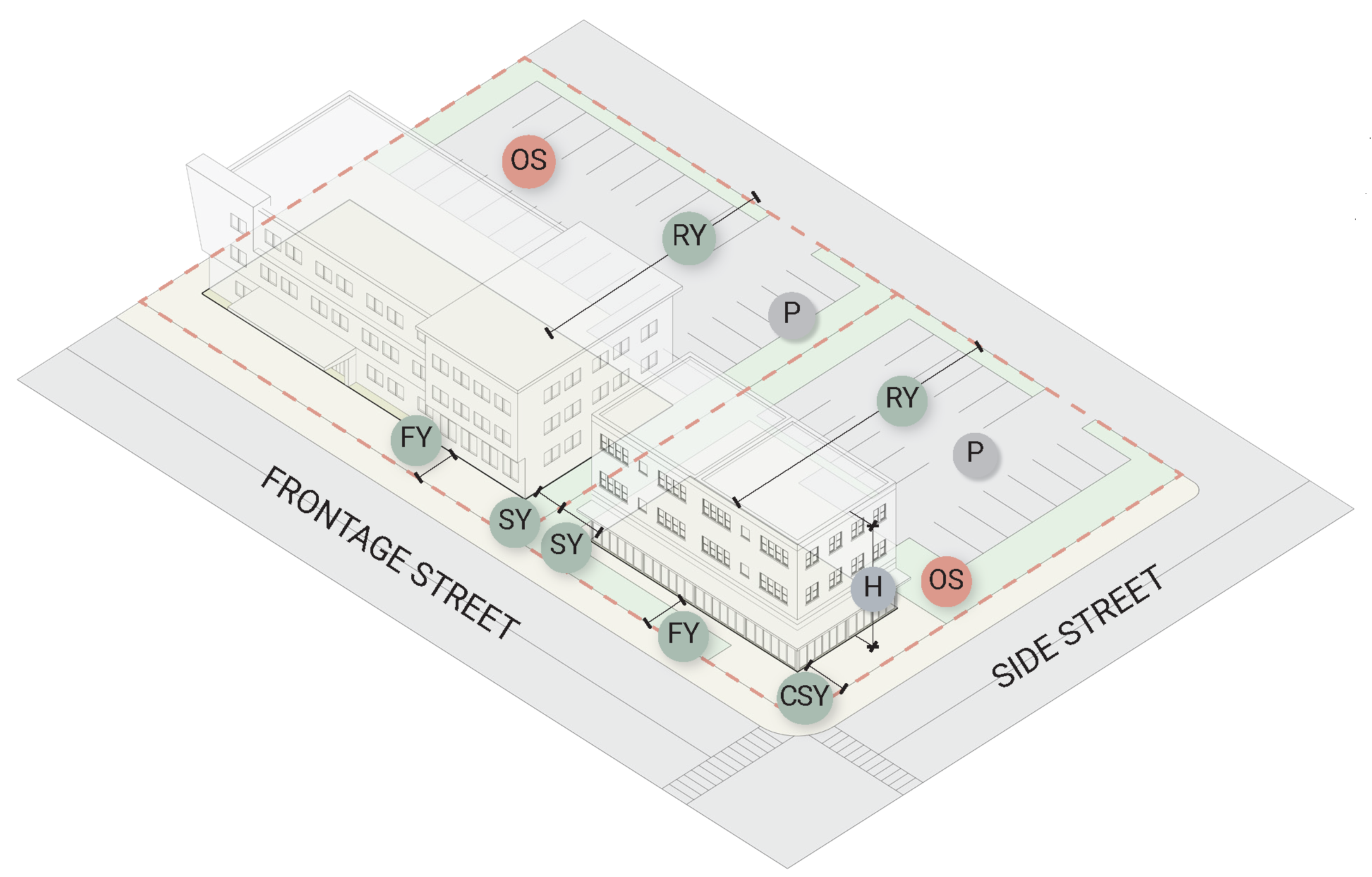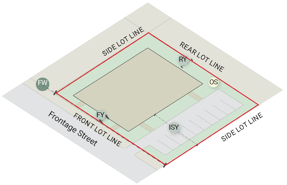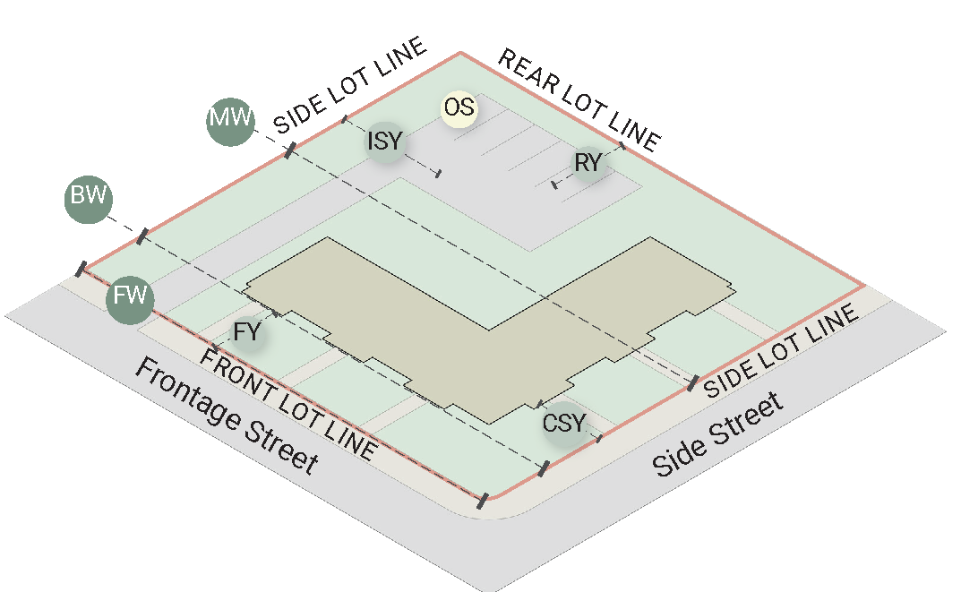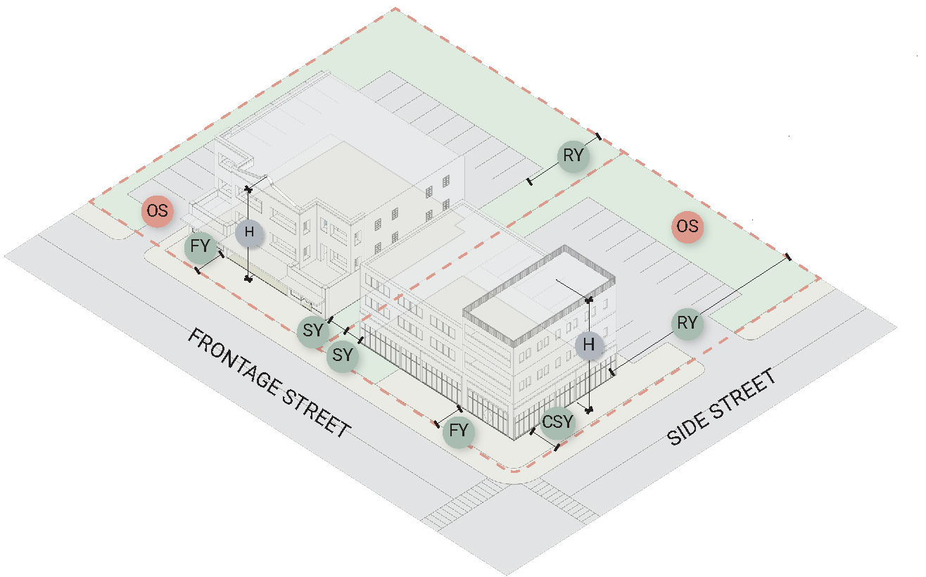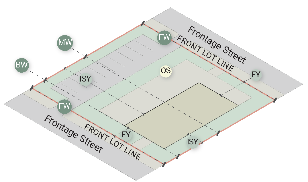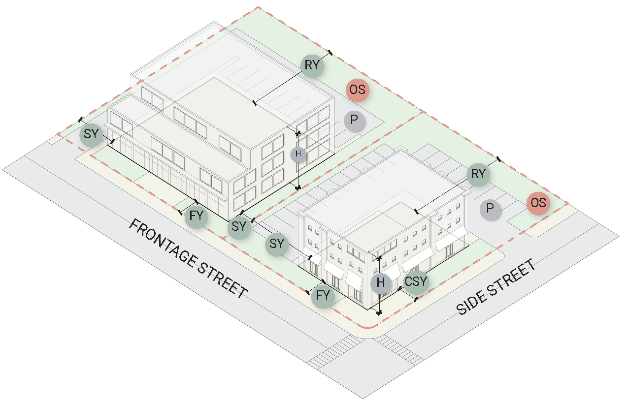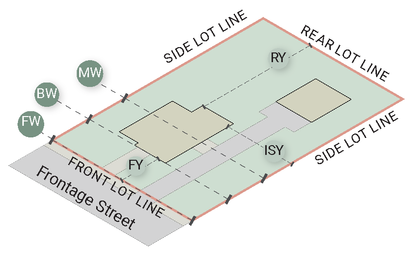 The diagrams and text below define dimensional terms and direct how to measure lot and structure dimensions. All terms are also referenced in Article 9 - Definitions.