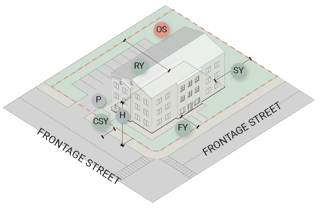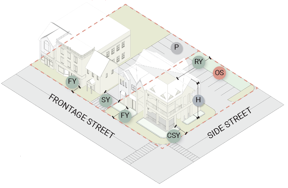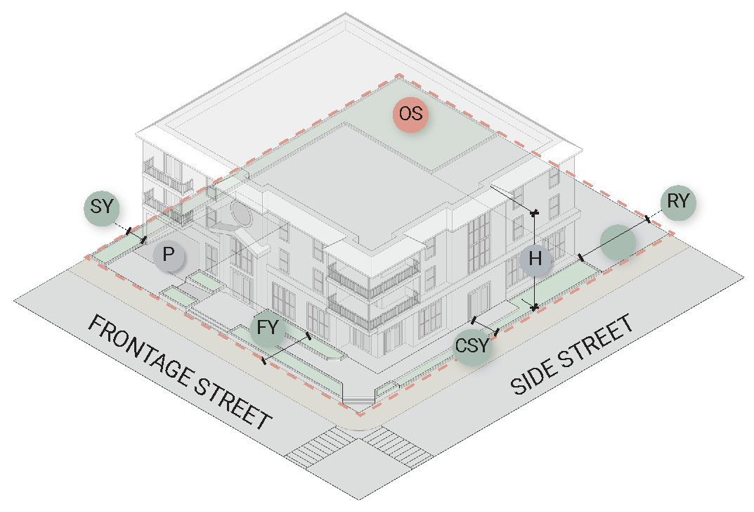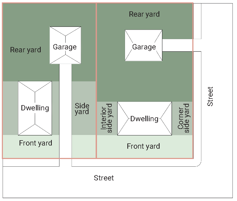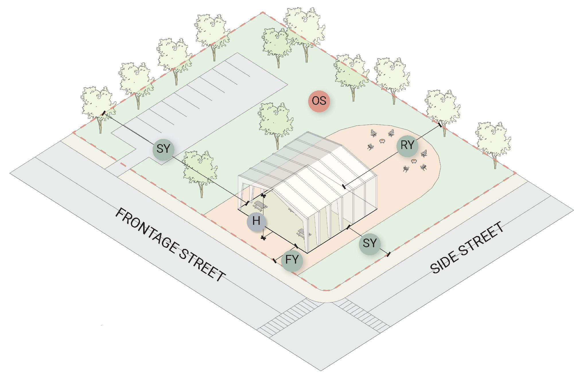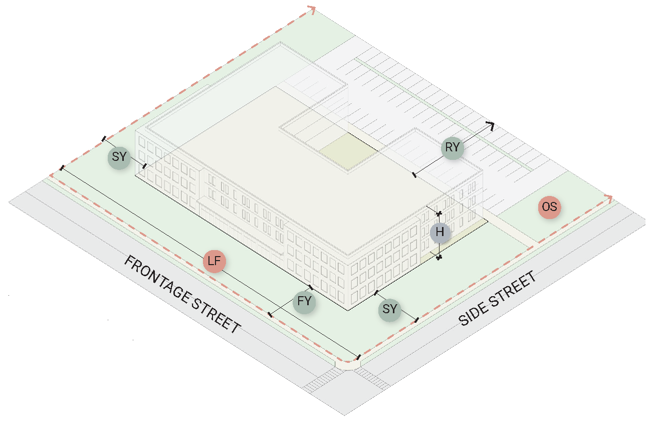 The diagrams and text below define dimensional terms and direct how to measure lot and structure dimensions. All terms are also referenced in Article 9 - Definitions.