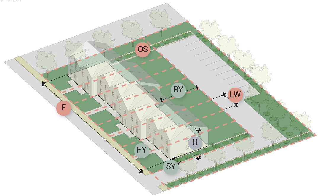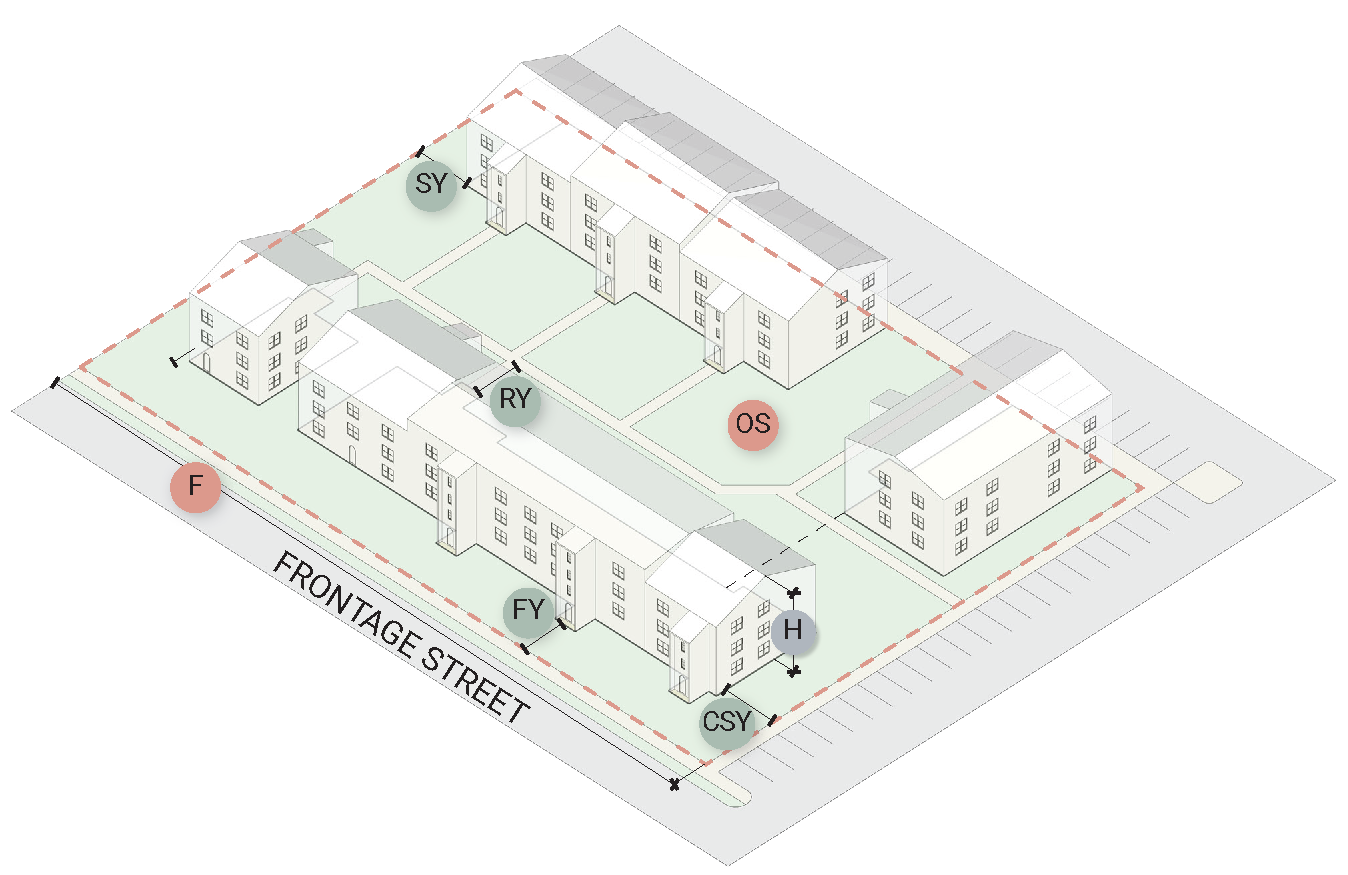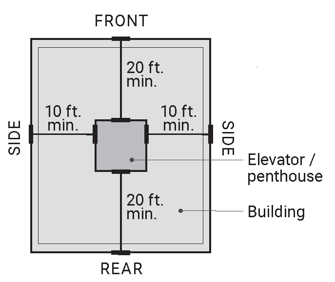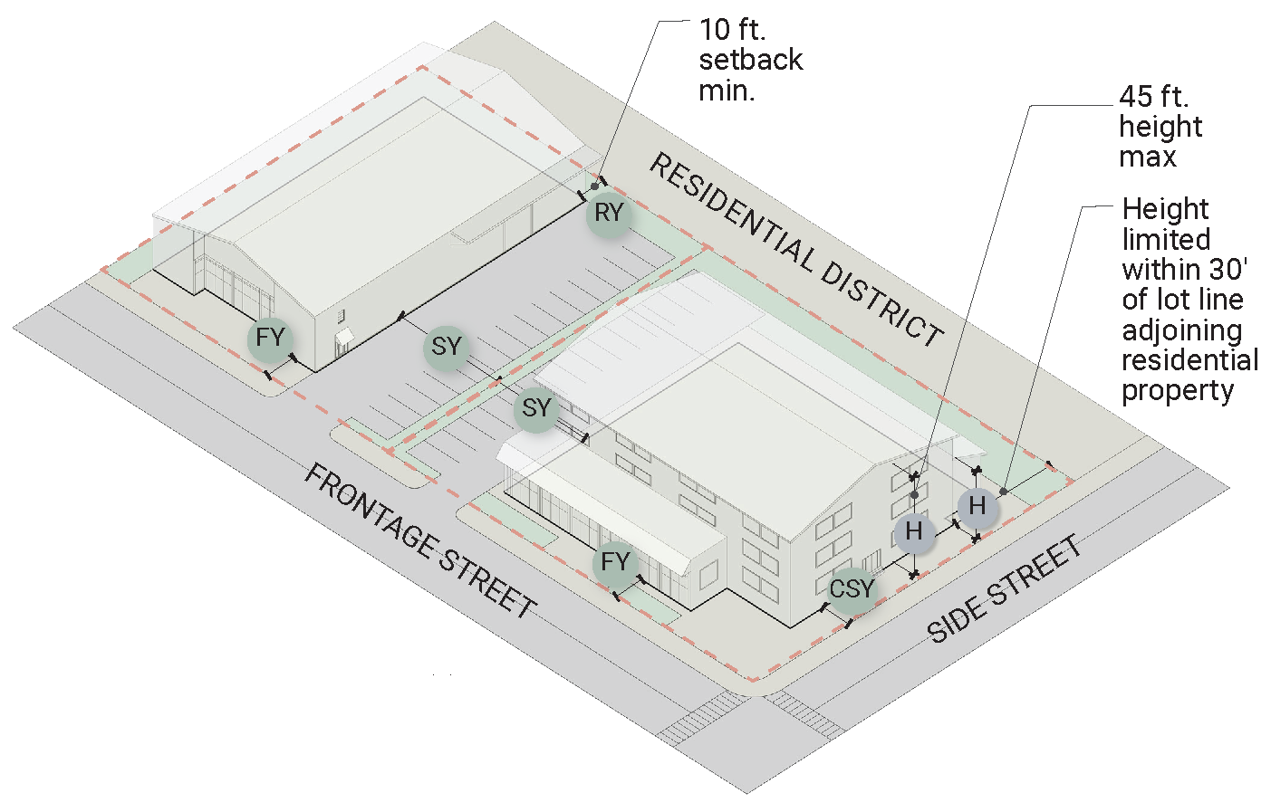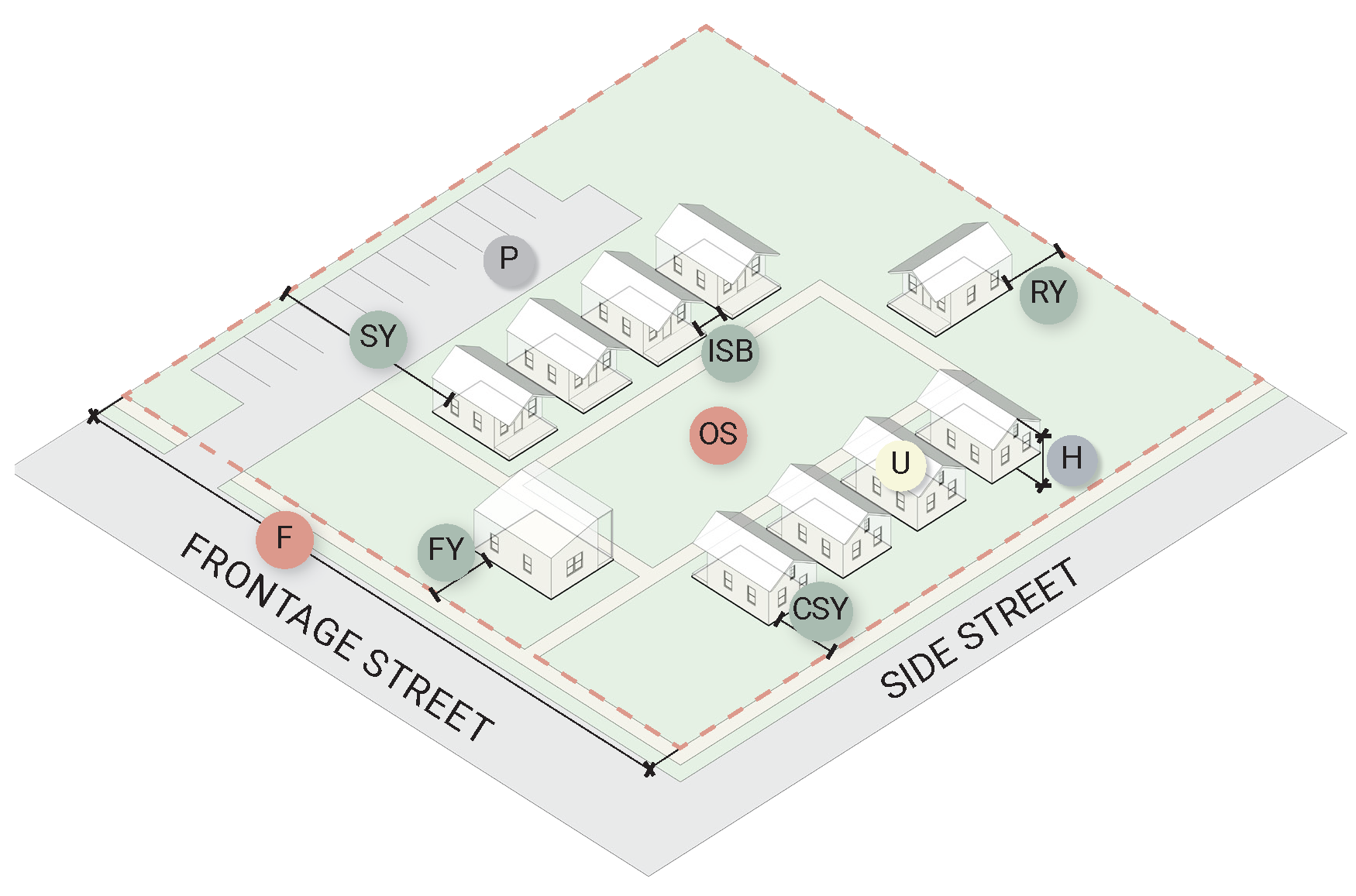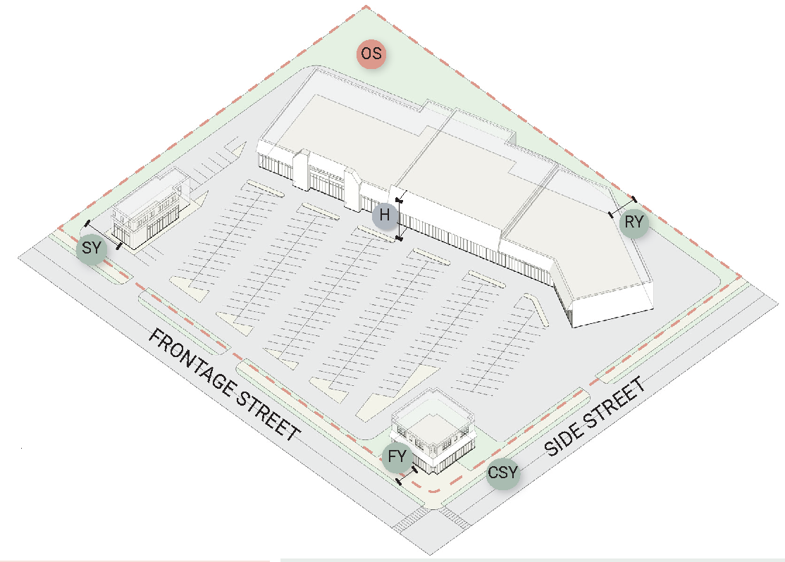 The diagrams and text below define dimensional terms and direct how to measure lot and structure dimensions. All terms are also referenced in Article 9 - Definitions.