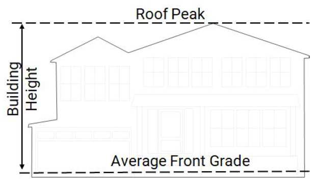 For principal structures, building height is the maximum vertical dimension measured from the average finished lot grade at the front of the principal building to the highest point of the roof.