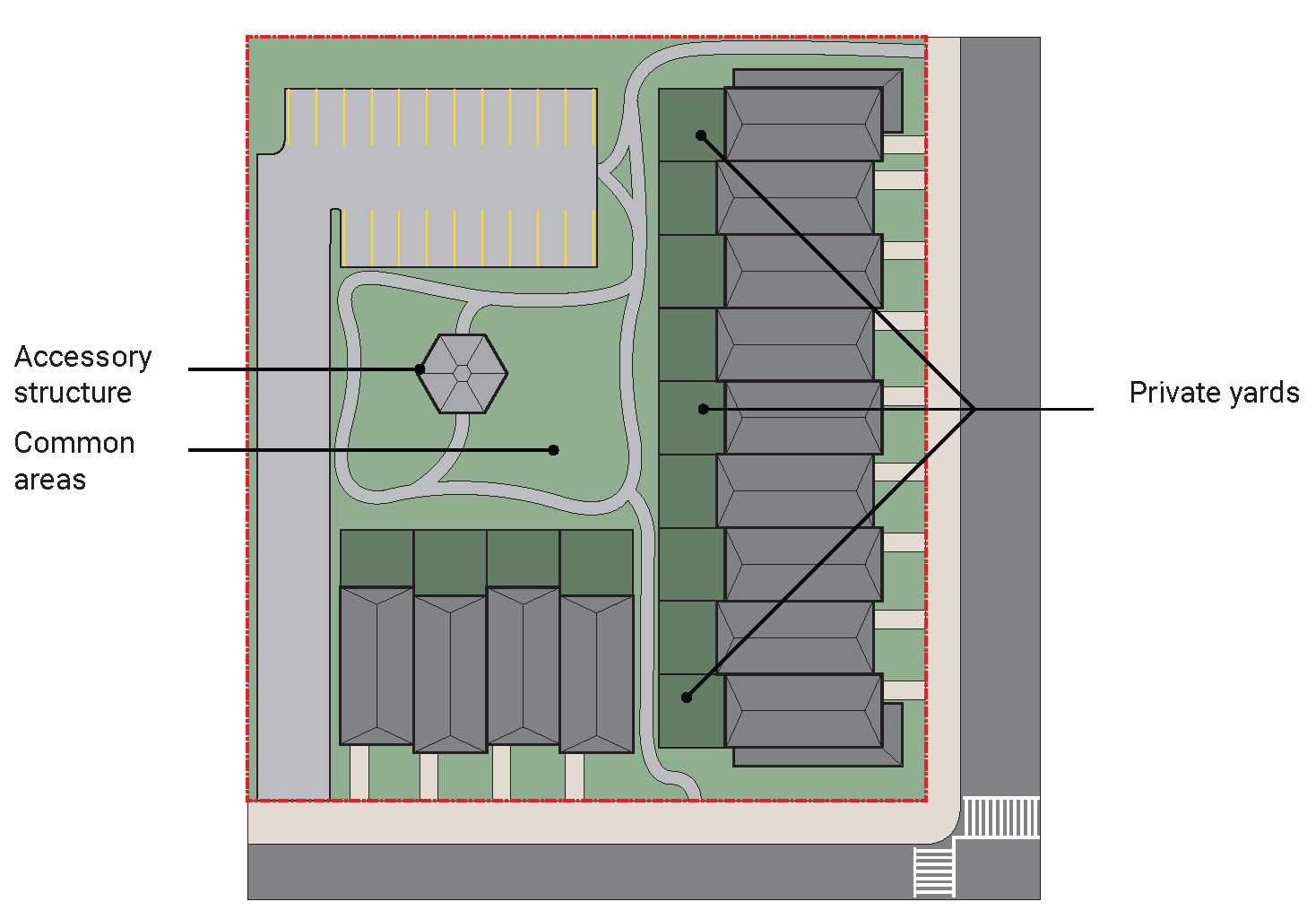FIGURE 4B.1. Example delineation between common areas and private yards in multi-unit