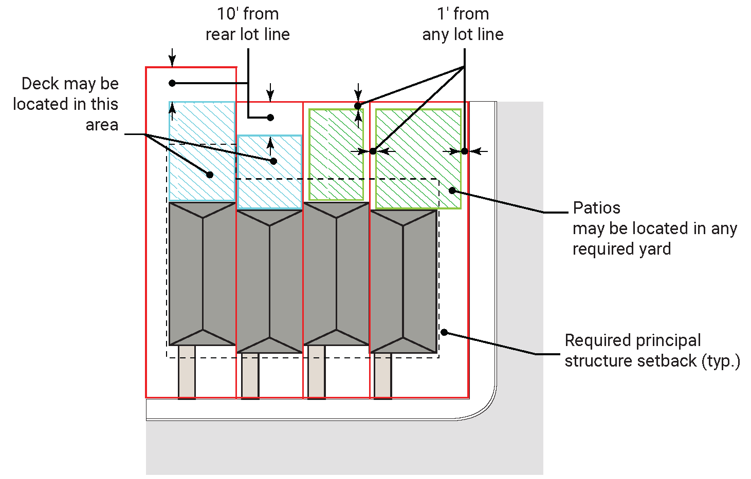 FIGURE 4B.2. Deck and patio setbacks in private yards in multi-unit residential development.