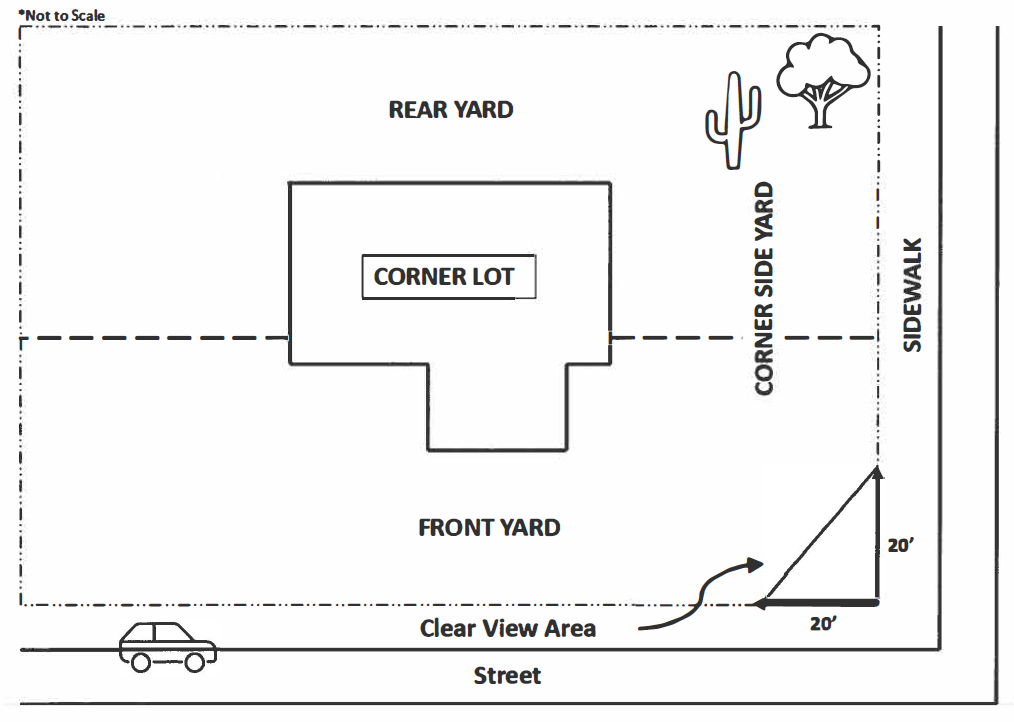 Clear view fencing requirements are intended to ensure safe sight line distances for both pedestrian and vehicular traffic in areas where such obstacles exist (i.e. fences, trees, landscaping). The following clear view requirements apply to all zones within the City: