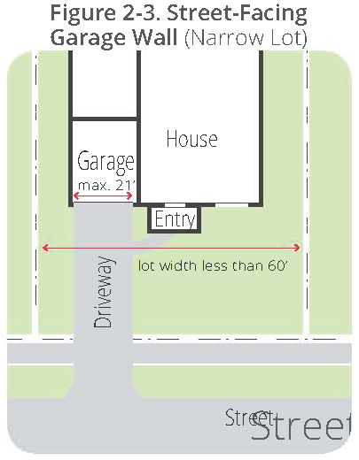 For lots that are less than 60 feet in width, the garage wall facing the street may not exceed 21 feet in length. See Figure 2-3.