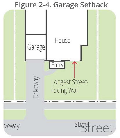 The length of the garage wall facing the street may not exceed 50% of the length of the street-facing building facade containing the primary pedestrian building entrance. See Figure 2-2.