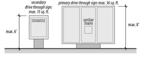 One primary drive-through sign not to exceed 36 square feet in area or eight (8) feet in height is allowed per order station up to a maximum of two (2) primary drive-through signs per lot. One secondary drive-through sign not to exceed sixteen (16) square feet in area or six (6) feet in height is allowed per order station, up to a maximum of two (2) secondary drive-through signs.