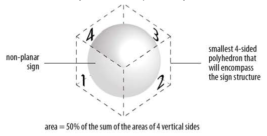 Spherical, free-form, sculptural or other non-planar sign area is measured as fifty (50) percent of the sum of the areas using only the four (4) vertical sides of the smallest four-sided polyhedron that will encompass the sign structure. Signs with greater than four (4) polyhedron faces are prohibited.