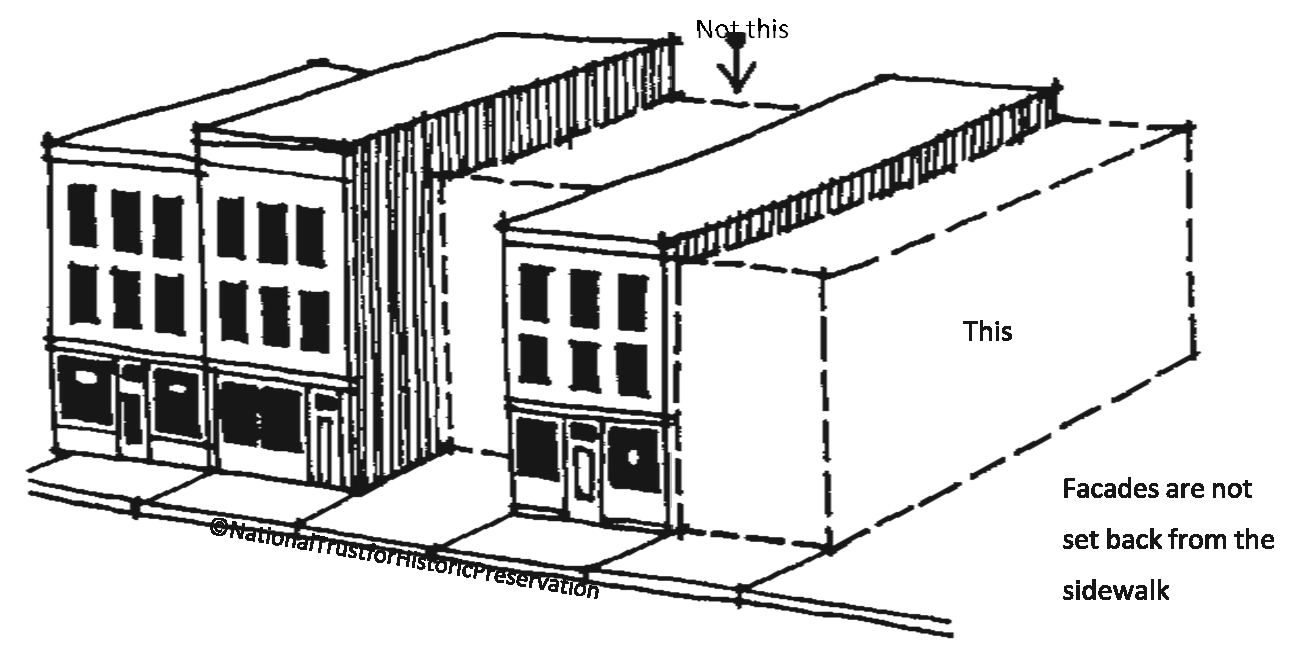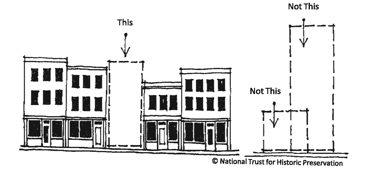 HEIGHT. Buildings in town centers or established neighborhoods share a similar height. Infill construction should respect this. A new facade that is too high or low can interrupt this consistent quality.