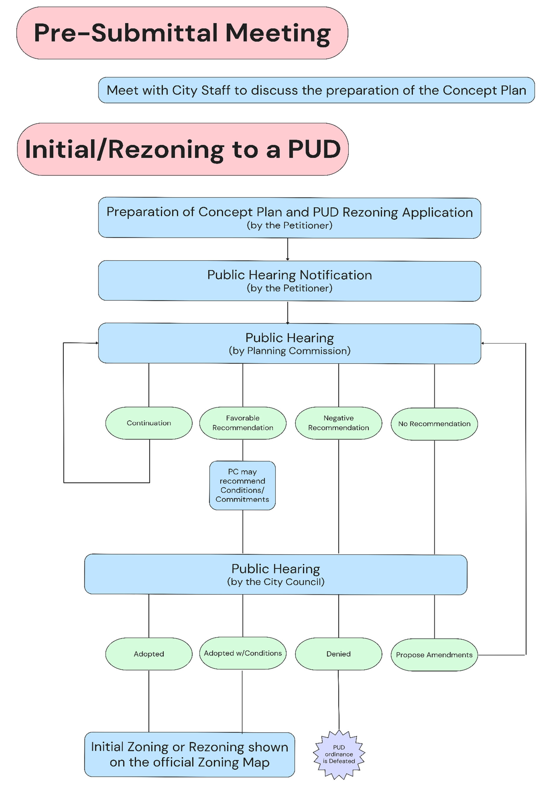 The section establishes procedures for the review, approval and development of a Planned Unit Development District. There are four basic steps in the PUD process which are illustrated in sequence in the flow charts on the following pages and which are described below: