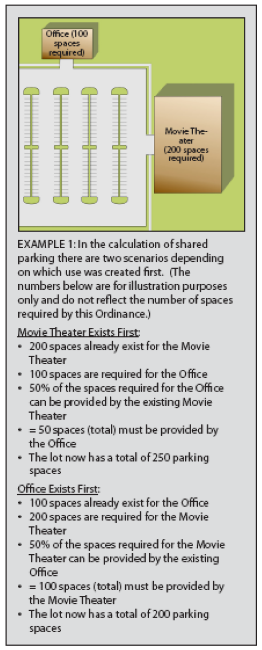 Uses with Dissimilar Business Hours. Churches, civic clubs, auditoriums, lodge halls, banquet halls, movie theaters, and stadiums may make arrangements with existing business establishments which normally have different hours of operation for sharing up to fifty percent (50%) of their required parking spaces (Example 1), provided however, where there is a sharing of facilities by different owners or tenants, there shall be a written agreement approved by the Planning & Zoning Commission. In addition, should any of the uses having a joint agreement after passage of this Ordinance be changed or facilities discontinued, then the required spaces for the use or uses remaining shall be provided elsewhere as a condition precedent to the continued use of the building or buildings. The approved agreement shall be recorded with the County Recorder, and a copy kept on file with the Community Development department.