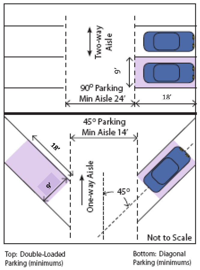 Minimum Size and Maneuvering Space. The minimum size of a parking space shall be as shown on Table 7.1, Parking Dimensions, and Figure 7.2, Parking Aisle and Space Dimensions. In no instance shall the overhang of a vehicle be considered as part of the required parking space area. Minimum dimensions for semi tractor-trailer parking at truck stops shall be 12.5' x 65'.