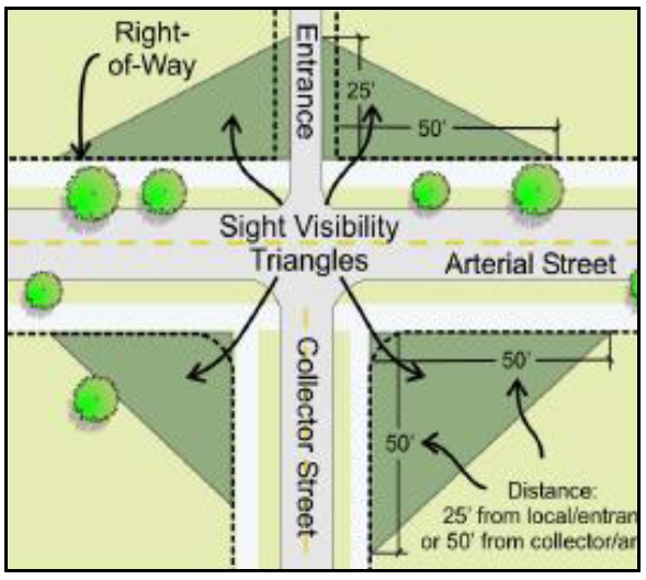 All curb cuts shall meet horizontal and vertical sight distance requirements as set forth in Section 304.4 of the City of Villa Rica Development Regulations. The distance from the centerline of the driveway entrance to the centerline of the nearest street intersection shall not be less than 150 linear feet.