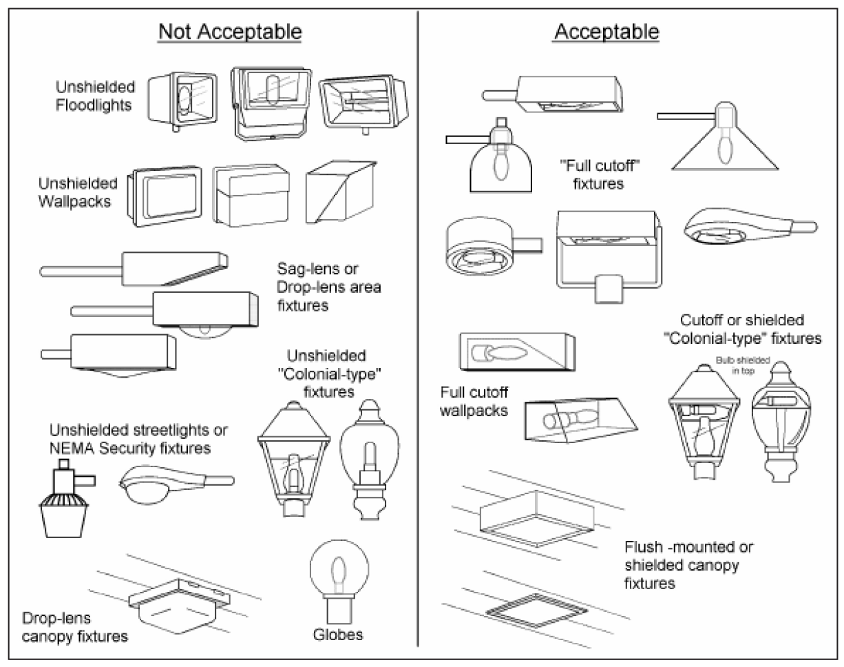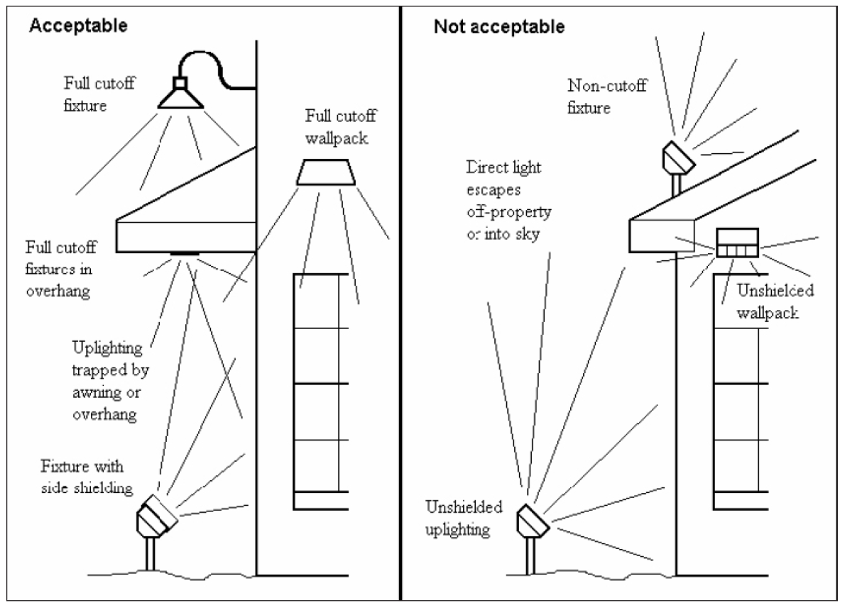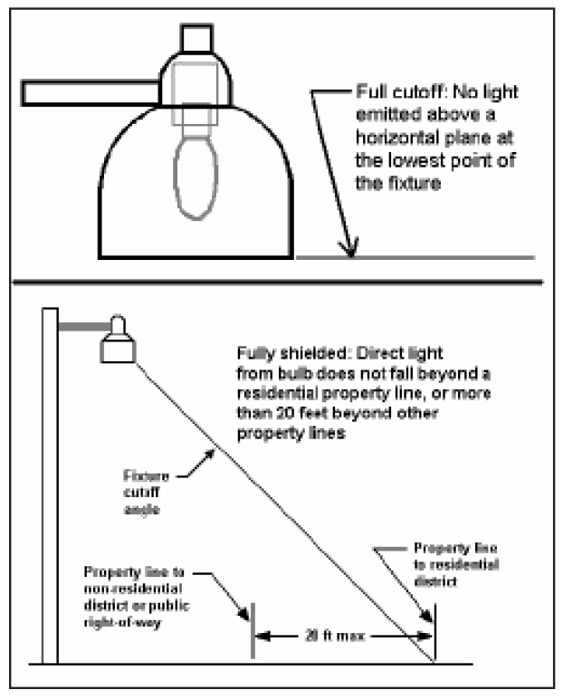 Lighting fixtures shall include hoods or other design techniques to reduce glare and light pollution, especially along major streets, and to prevent light spillover onto adjacent properties.