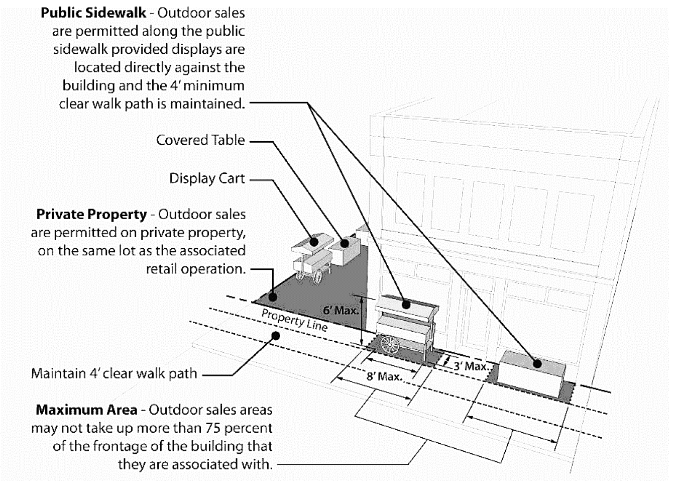 Outdoor Storage, Sales, and Display. Outdoor storage of merchandise in commercial and industrial districts is permitted only as regulated in Section 8.13 - Outdoor Sales, Display, and Storage Standards. Accessory structures in commercial and industrial districts should not alter the character of the district.
