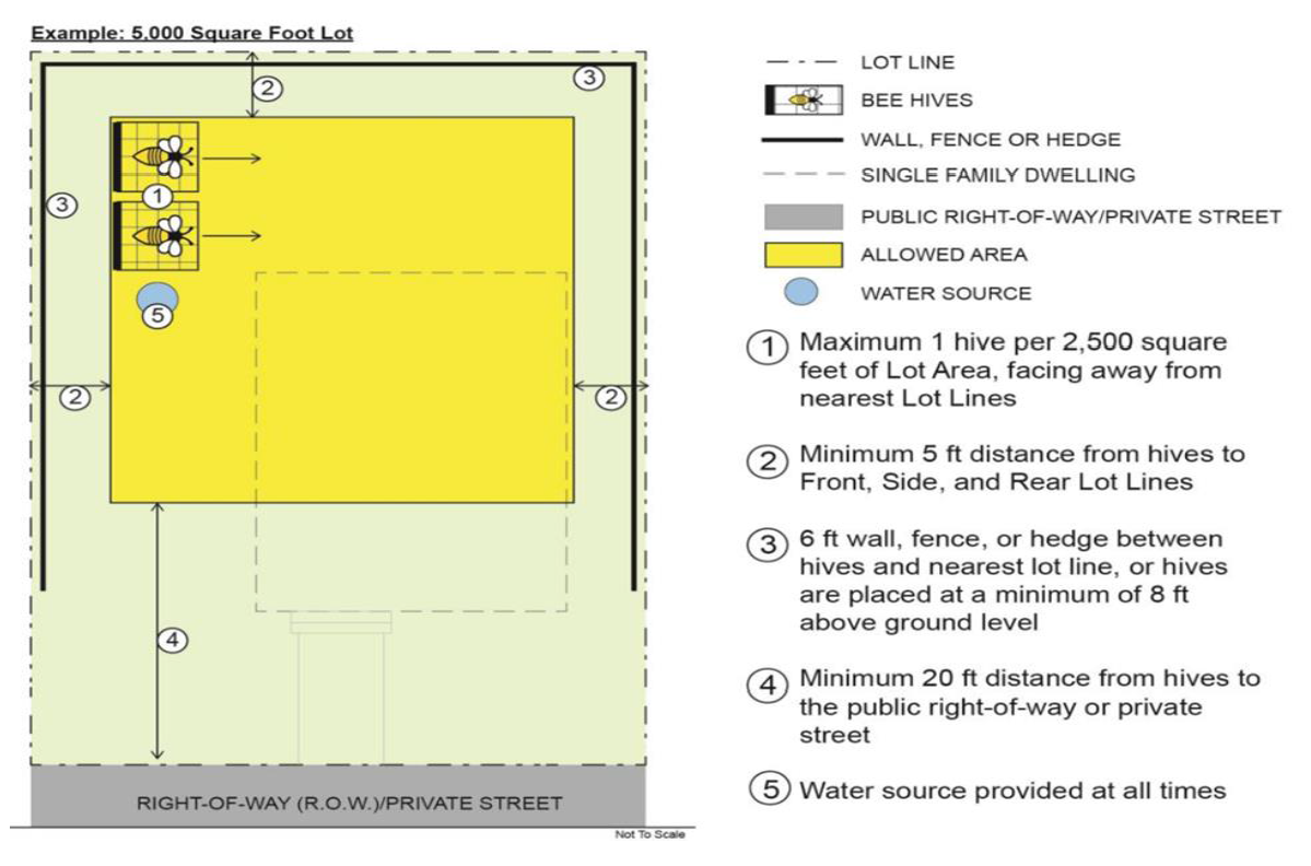 Location and Setbacks. No beehive shall be kept closer than five (5) feet to any lot line and ten (10) feet to a dwelling or the permitted placement of a dwelling on another parcel, and no beehive shall be kept in a required front yard or side street yard. The front of any beehive shall face away from the property line of the Residential property closest to the beehive.