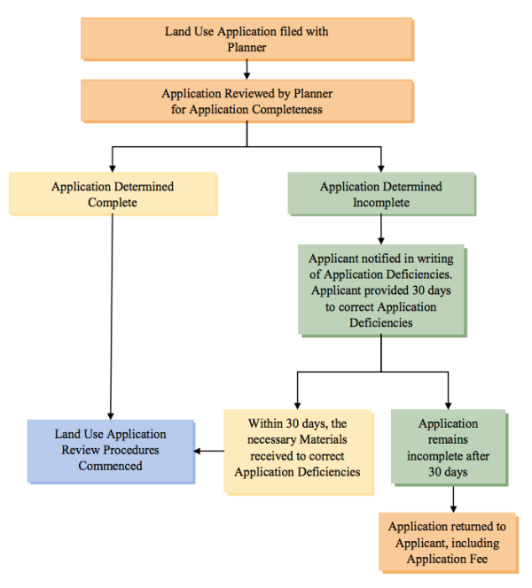 After the receipt of a Land Use Application, the Planner shall determine if the Application is complete (Figure 12-1). If the Planner determines the Application complete, the Application review procedures may be commenced. If the Planner determines that the Application is incomplete, the Planner shall notify the Applicant in writing, identifying the Application deficiencies, and advising the Applicant that no action will be taken by the Land Use Authority, as applicable, until all Application deficiencies have been corrected (Figure 12-1).