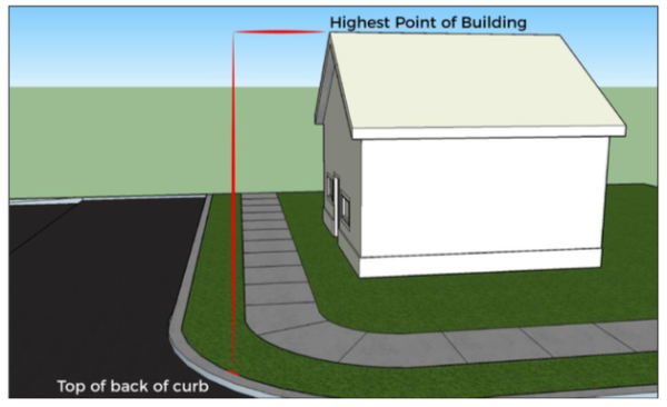 Building, Height: The vertical distance from the TOP OF THE BACK OF CURB to the highest point of the building or structure.