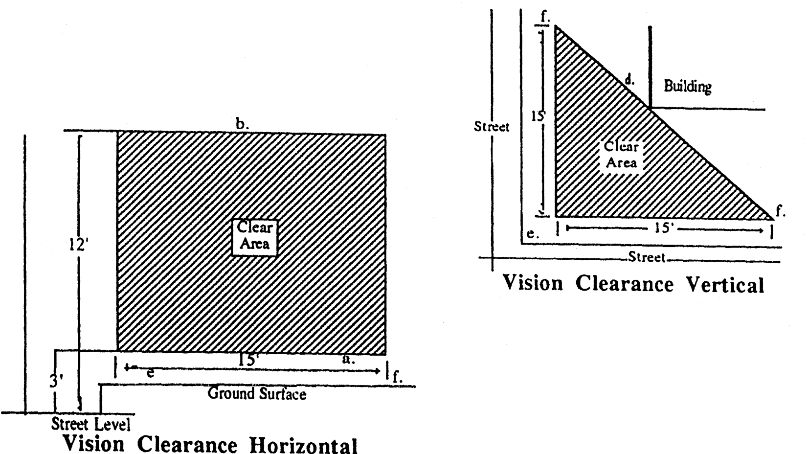Vision clearance on corner lots—A triangular space at the street corner of a corner lot, free from any kind of construction to vision between the heights of two (2) and twelve (12) feet above the established street grade. The street grade is measured at the intersection of the center lines of the intersecting street pavements, and the triangular space is determined by a diagonal line connecting two (2) points measured fifteen (15) feet along each of the street property lines equidistant from the intersection of the property lines or the property line extended, at the corner of the lot.
