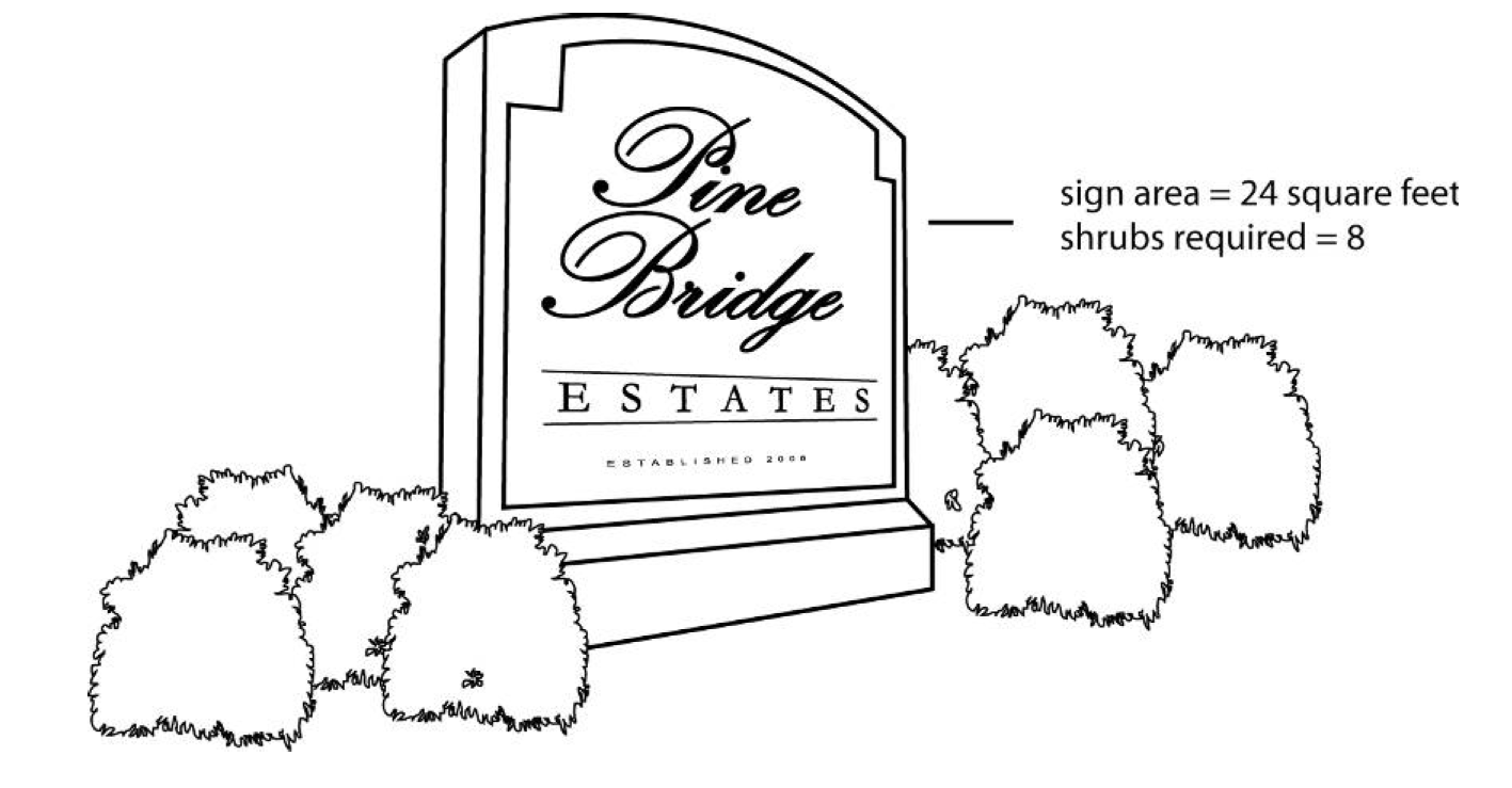 The area around the base of all freestanding signs on the site of nonresidential uses must be planted with shrubs, at a rate of one shrub for every four square feet of sign area (or portion thereof). Additional landscaping is encouraged in the form of trees, flowers, and ground cover.