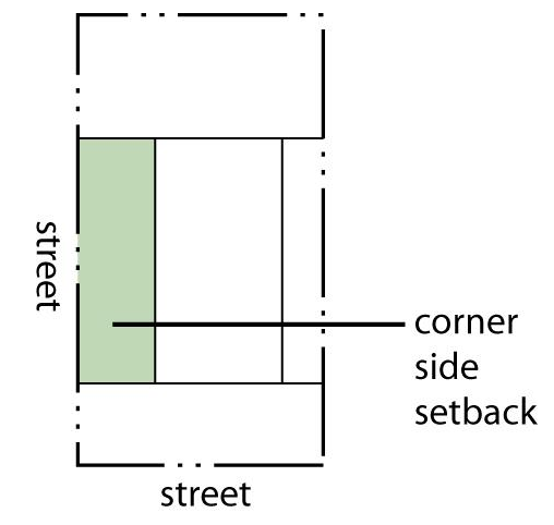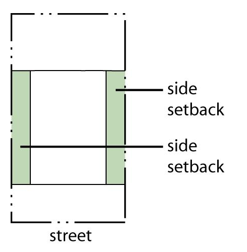 Setback, Side means the setback required between a building and the side property line of the lot on which the building is located, extending along a side property line from the point of the minimum front setback to the point of the minimum rear setback.