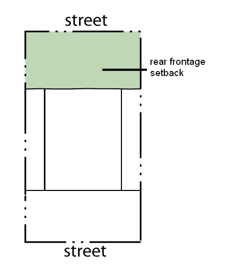 Setback, Rear Frontage means the setback required between a building and the rear frontage property line of the lot on which the building is located, extending along the full length of the rear property line between the side property lines. The rear frontage setback shall be the same as the front setback requirement of the corresponding Zoning District pursuant to Article 5.