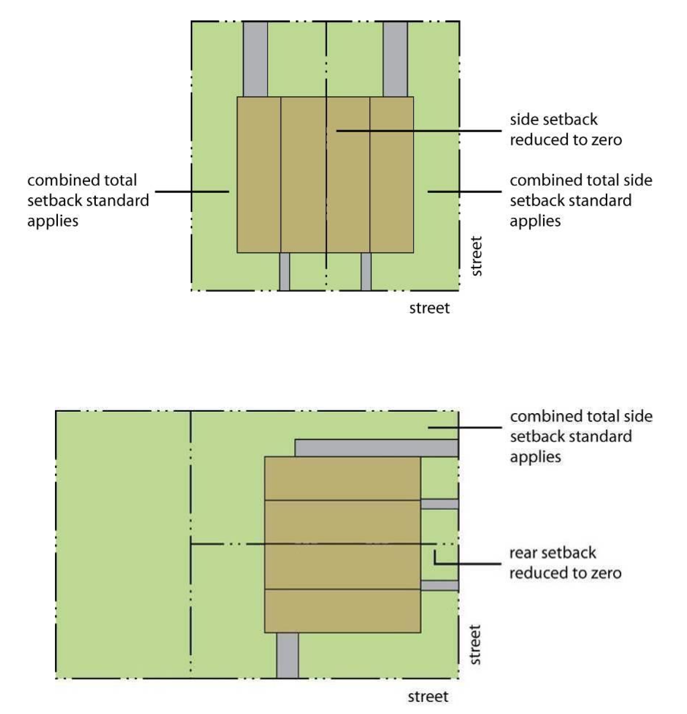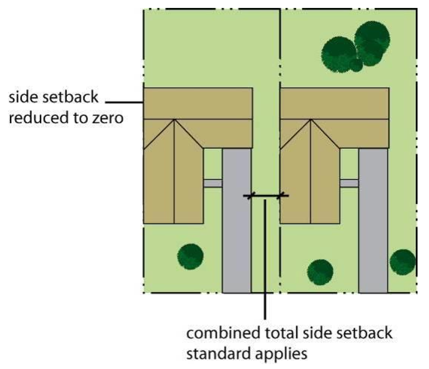 The side setback on one side of a lot line house may be reduced to zero. The minimum setback on the other side of the lot must equal at least two times the side setback standard of Section 5-11.
