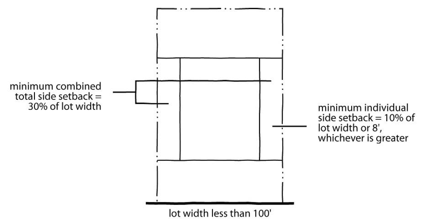 On lots having an average width of less than 100 feet the combined total width of both side setbacks may be reduced to 30 percent of the lot width, and individual side setbacks may be reduced to ten percent of the lot width or eight feet, whichever is greater.