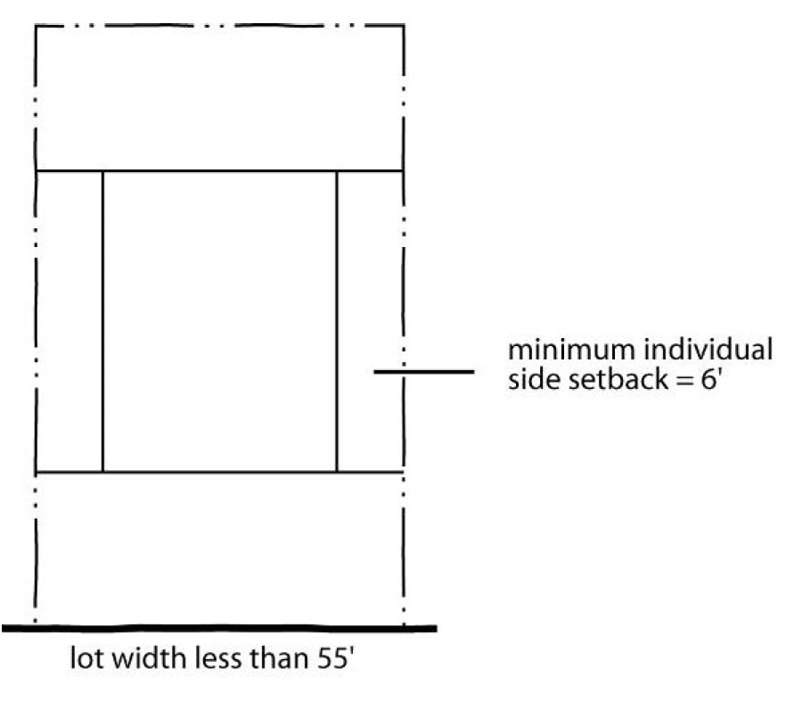 On lots having an average width of less than 55 feet, individual side setbacks may be reduced to six feet.