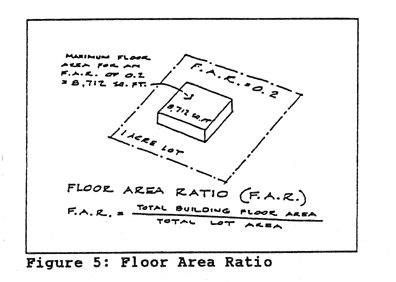 Floor area ratio means the gross floor area of all buildings on a lot divided by the lot area. See Figure 5. Floor Area Ratio.