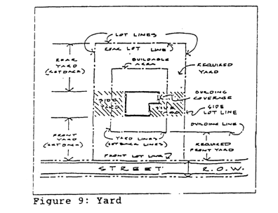 Yard means an open space on a lot situated between the principal building or use on the lot and a lot line and unoccupied by any structure, except as otherwise provided herein. See Figure 9. Yard.