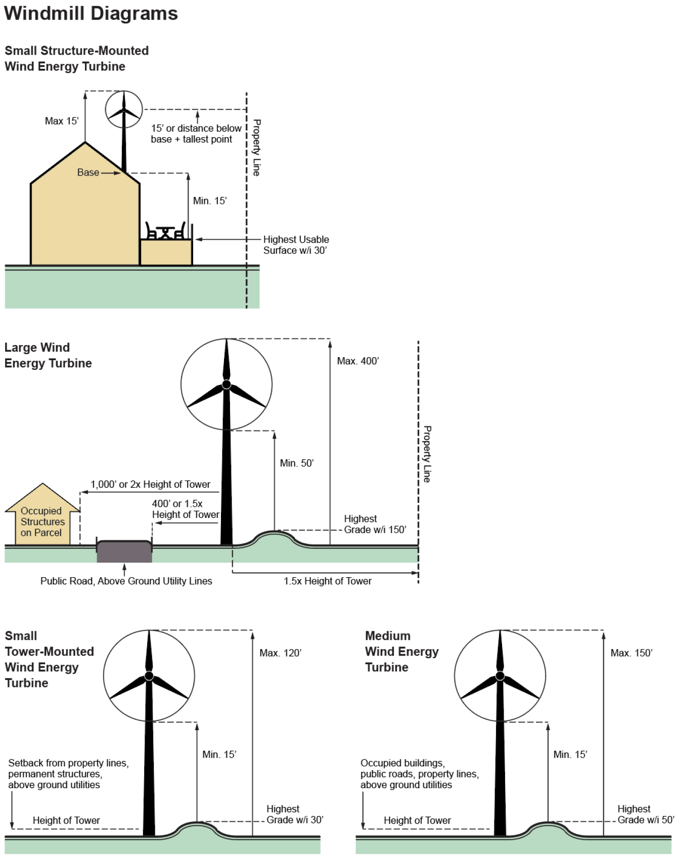 Property line setbacks. With the exception of the locations of public roads (see below) and parcels with occupied buildings (see above), all internal property line setbacks shall be a minimum of one and one-half times the total height of the L-WET, as measured from the base of the tower. This setback may be reduced by the planning commission as part of a special use permit if the applicant provides a registered engineer's certification that the L-WET is designed to collapse, fall, curl, or bend within a distance or zone shorter than the total height of the WET.