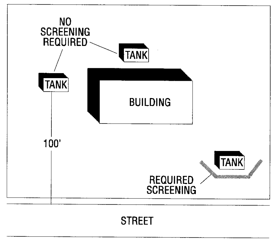 Development Standards. .....Above ground storage tanks which are accessory to offices, businesses, industries, or on sites of institution or utility uses and which are located within one hundred (100) feet of any public right-of-way and not screened by a building from the street or not located within ten (10) feet of a principal building, shall meet the following standards.