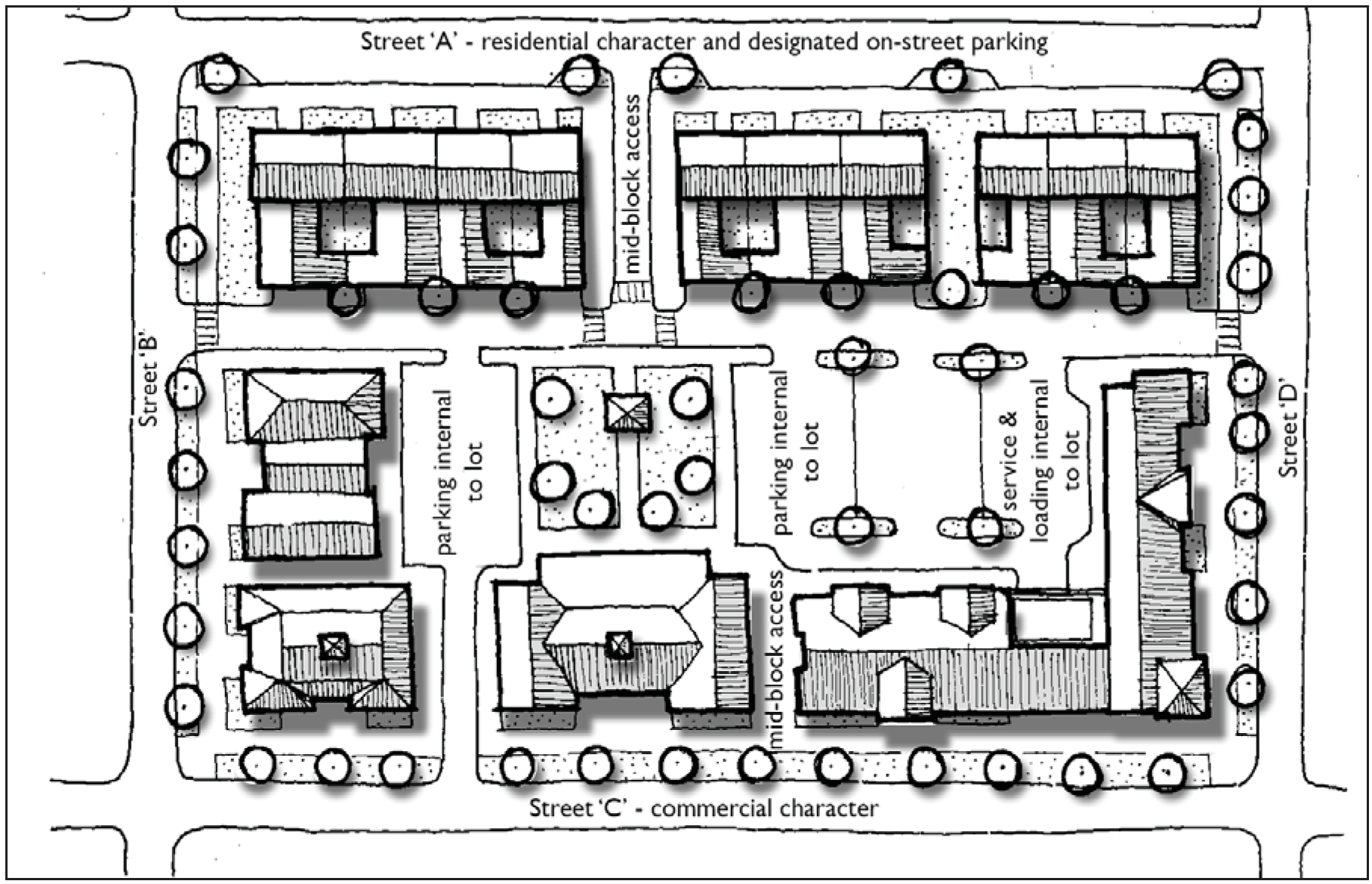 Off street parking shall be to the side and rear of buildings. Shared parking arrangements shall be permitted subject to the Development Order review and approval.