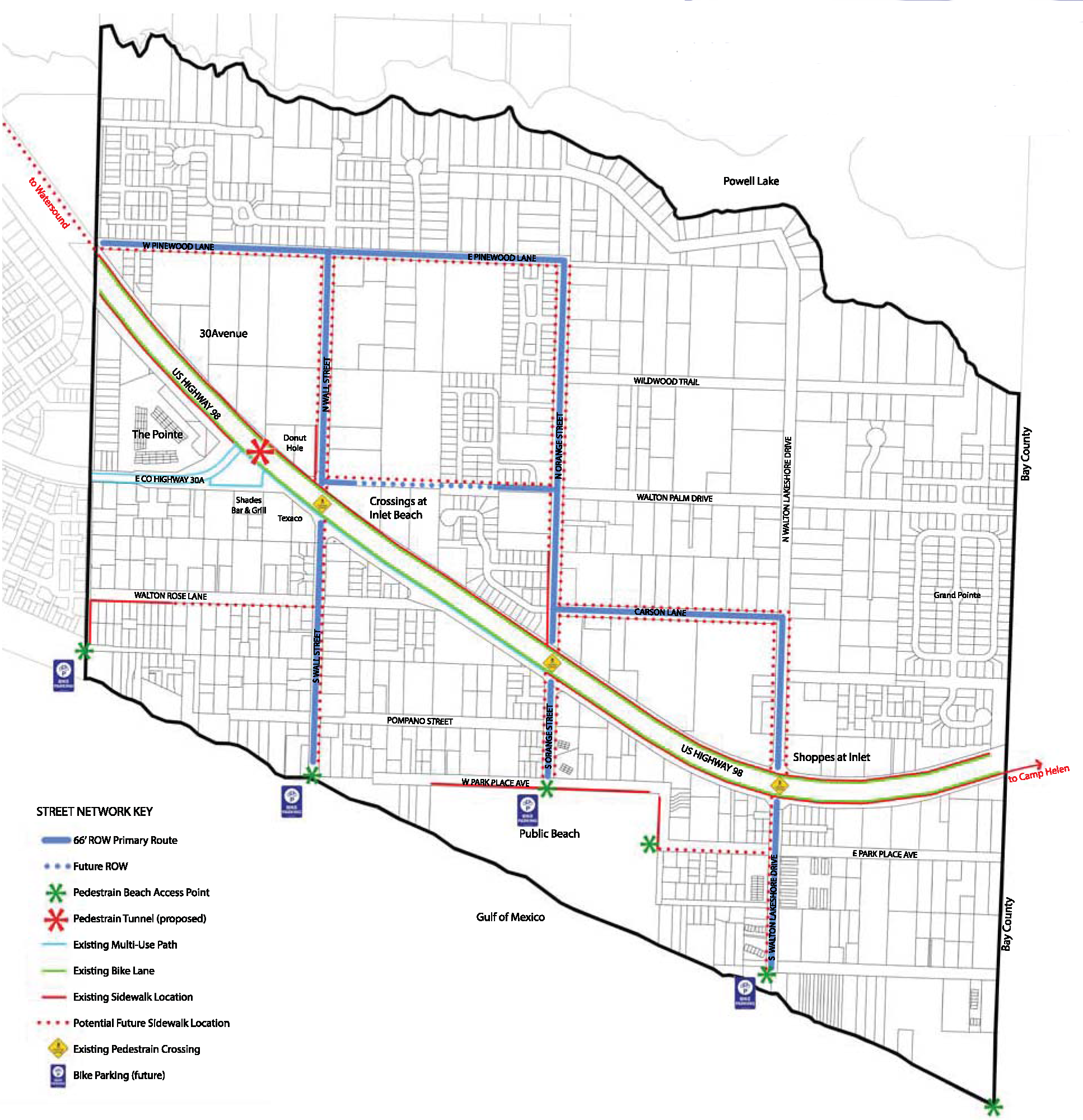 3.1.1(A) A key feature to this plan is identifying pedestrian and bicycle routes between higher density residential areas, commercial areas and the beach access points. In addition to encouraging this non-vehicular traffic throughout the neighborhood, these established safe routes would direct pedestrian/bicycle traffic to the proposed tunnel under US Highway 98. As development occurs along these routes, installation of sidewalks or other improvements may be required along the developing property's street frontage. Key routes have been identified as the following corridors: