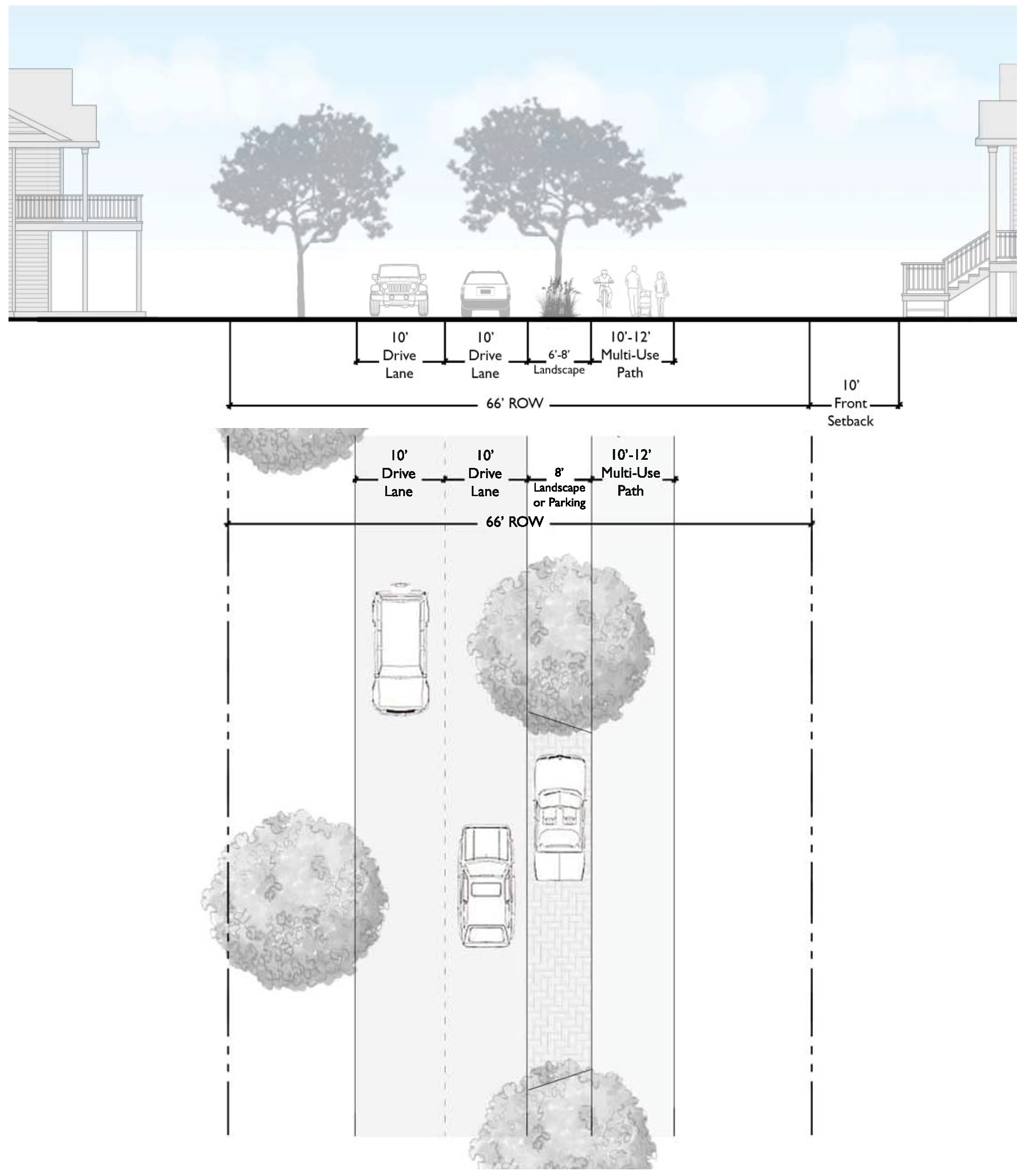 3.1.2(A) Multi-Use Path Option. This street section may be appropriate for N. Orange Street or Pinewood Lane where a more rural residential character is established and most existing homes will either back up to or present side yards to the street. Within the existing sixty-six foot (66') ROW, a multi-use path shall be installed on one side. The multi-use path should be a minimum of ten feet (10') in width and separated from the vehicular drive lanes by a landscape area. This landscape area could accommodate a water quality swale and street trees. Alternatively, if a need for designated on-street parking should arise, these spaces could be carved out of the existing landscape zone, leaving the street trees in place. In the graphic below, two on-street parallel parking spaces are shown between street trees.