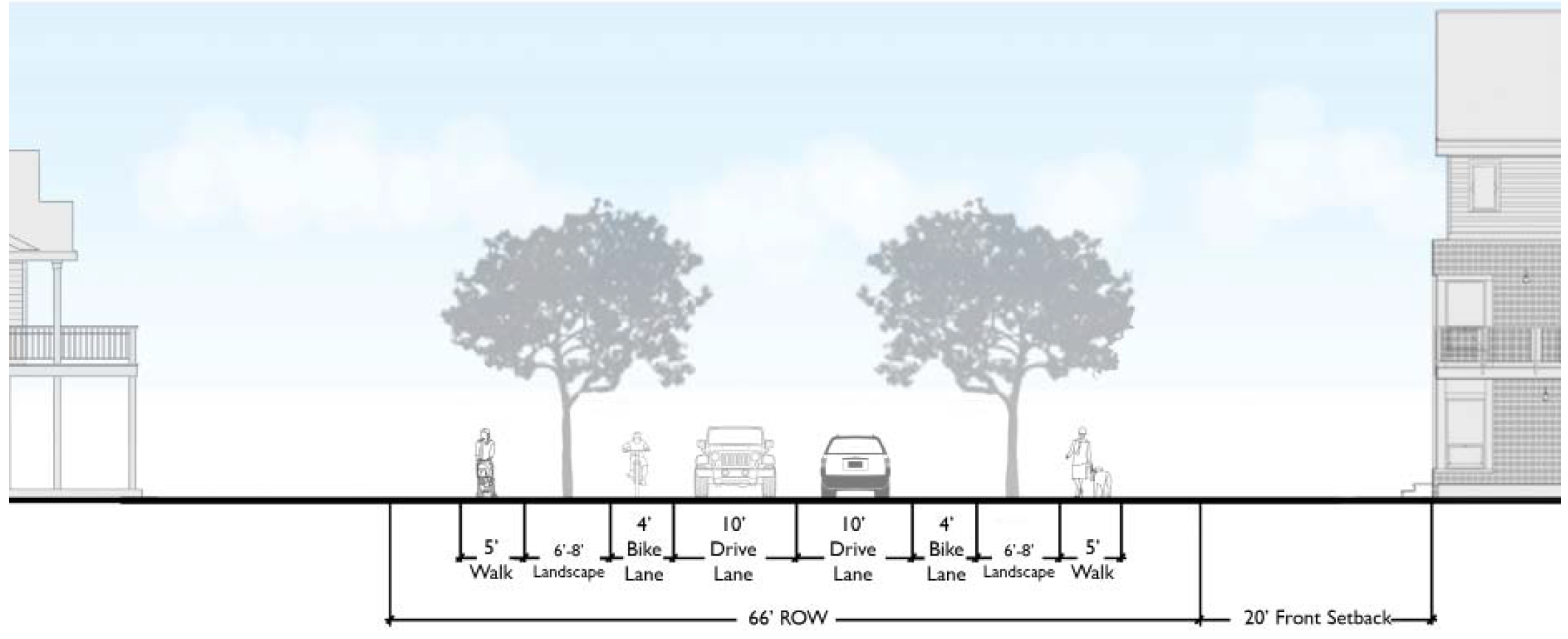 To demonstrate potential development options for improving the existing ROWs described above as key routes, a series of street sections were created. As new development occurs along the key routes identified on this plan, participation in the construction of sidewalks, multi-use paths, or dedicated bicycle lanes shall be required along the frontage of the developing parcel.