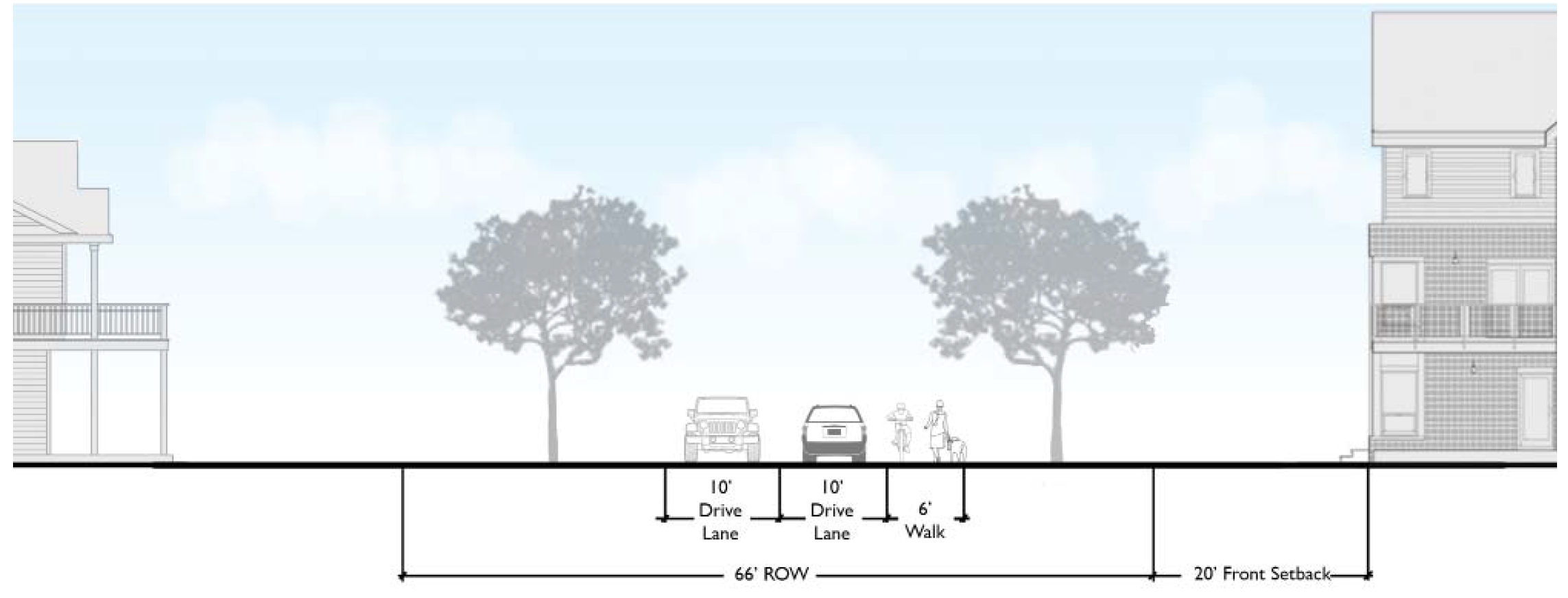 3.1.2(C) Sidewalk Only Option. On existing residential streets, space to expand the existing roadway to include bike lanes, sidewalks and street trees may not be practical due to existing landscape and driveways. In these cases, expanding the existing asphalt from twenty feet (20') to twenty-six feet (26') and striping a dedicated pedestrian lane could be a reasonable alternative. This street section would be appropriate along S. Wall Street, Walton Rose Lane, S. Walton Lakeshore Drive and E. Park Place Ave.