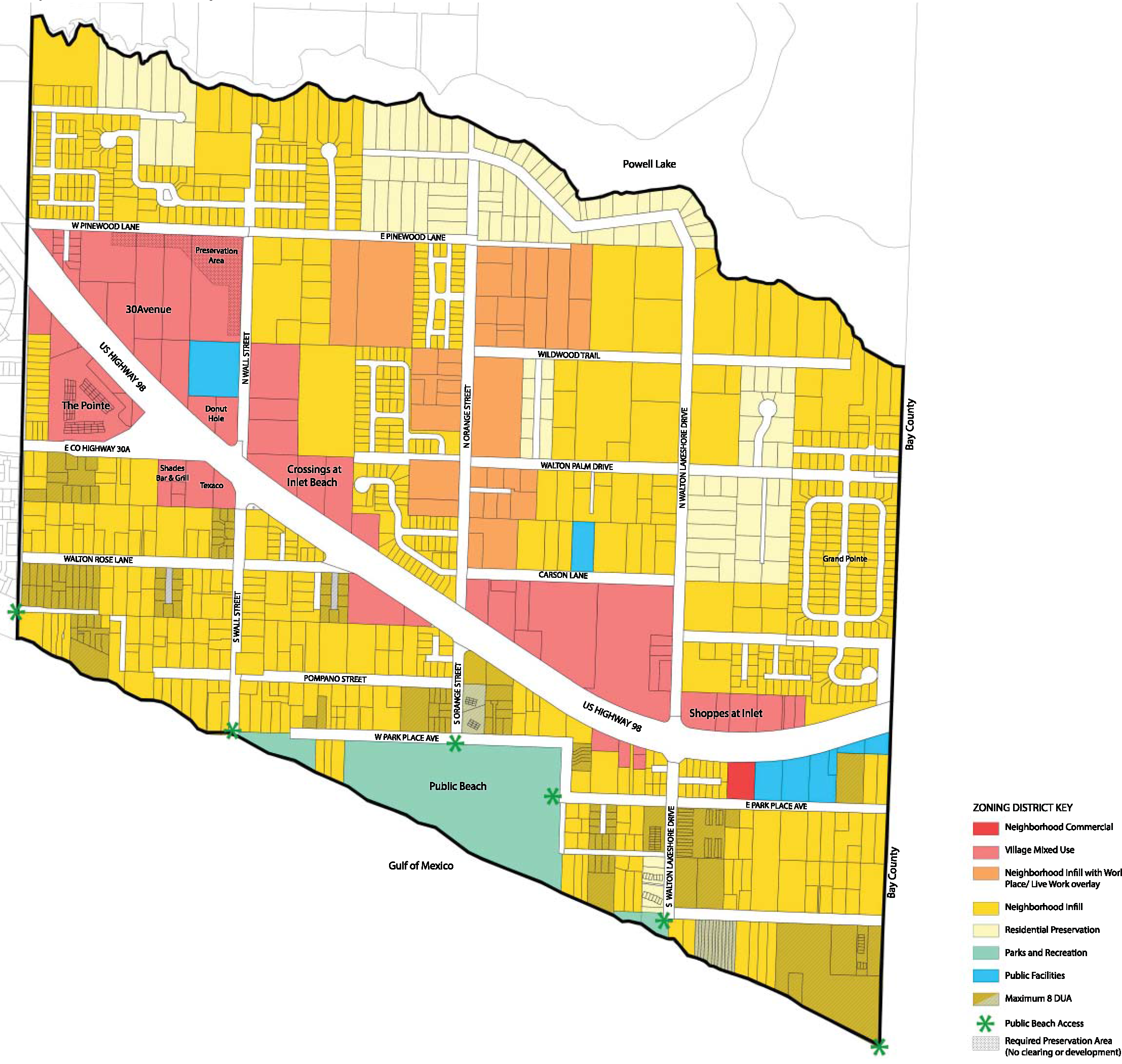 2.1.2 Generally: The Inlet Beach Neighborhood Plan is a zoning overlay to the Walton County Official Zoning Map. All development criteria and allowable uses will first conform to the base zoning district, as outlined in Chapter 2 of the Walton County Land Development Code. This neighborhood plan overlay then imposes additional limitations and guidelines, which are addressed in this section. The purpose of these additional restrictions and guidelines is to enforce specific community goals and protect the investments made in this community through encouraging high-quality development. By holding all new development to these standards, the neighborhood seeks to nurture the unique neighborhood character and development pattern already established and encourage safe pedestrian and bicycle traffic.