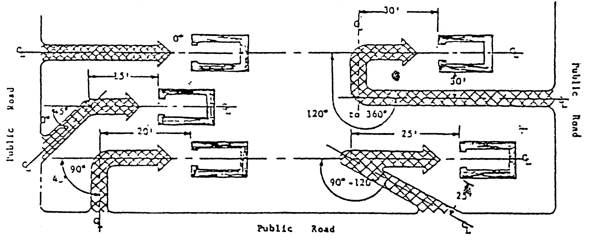 Stack space lanes shall be a minimum of ten (10) feet in width with pavement markings painted between lanes. The center line of the lane closest to the auto wash building must be set back a distance perpendicular to the building for the following turns in degrees from the lane to the bay entrance: