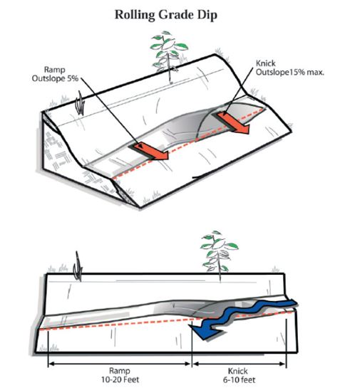 Rolling grade dips are a sustainable alternative to water bars. Dips are large enough to be self-cleaning and subtle enough that cyclest will not steer aroung them. A dip is longer than a bike and shaped like a knick. Use bondable soil from a dip to make a long, gentle ramp just past it. the ramp should be nearly twice as long as the dip.