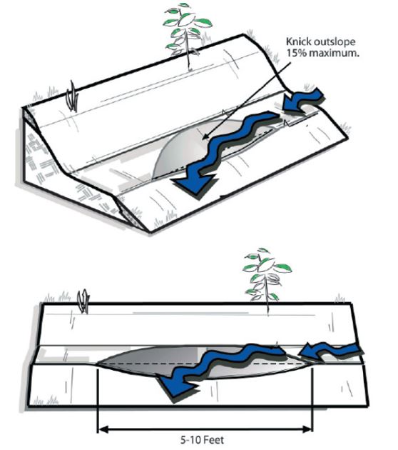 Knicks can be used on contour trails, to accentuate natural grade breaks and direct water off trails. Knicks should be long and subtle to be self-cleaning, yet unobtrusive to trail users.