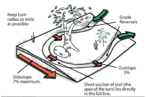 Maintain constant grade and raduis through the turn section. Climbing turns may not be sustainable on sideslopes exceeding 7 percent grade.