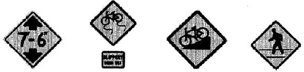 | Bikeway narrows | W5-4 | 450 x 450 | 18 x 18 |