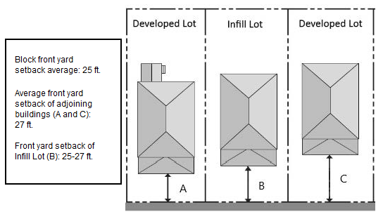 Minimum front yard setback: This distance is to be determined by the average of the existing structures located in the same block where the building is to be located.