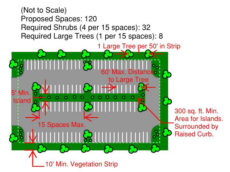 Parking areas with fifteen (15) or more parking spaces shall provide internal vegetation in the form of islands or peninsulas and shall be designed as such: