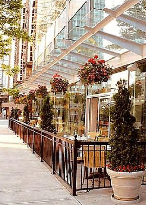 Perimeter posts, planters, decorative metal fencing not exceeding three feet in height, pots, hanging baskets or markers may be used to delineate the outdoor dining space.