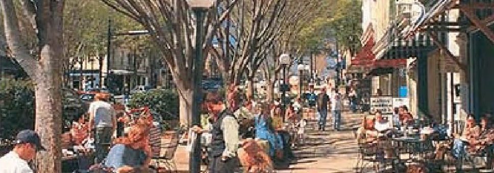 Outdoor dining enlivens the pedestrian environment. For ease of access, outdoor dining areas must be designed to allow unimpeded pedestrian passage around or through them. Outdoor dining helps create a visually attractive streetscape while promoting retail activity.