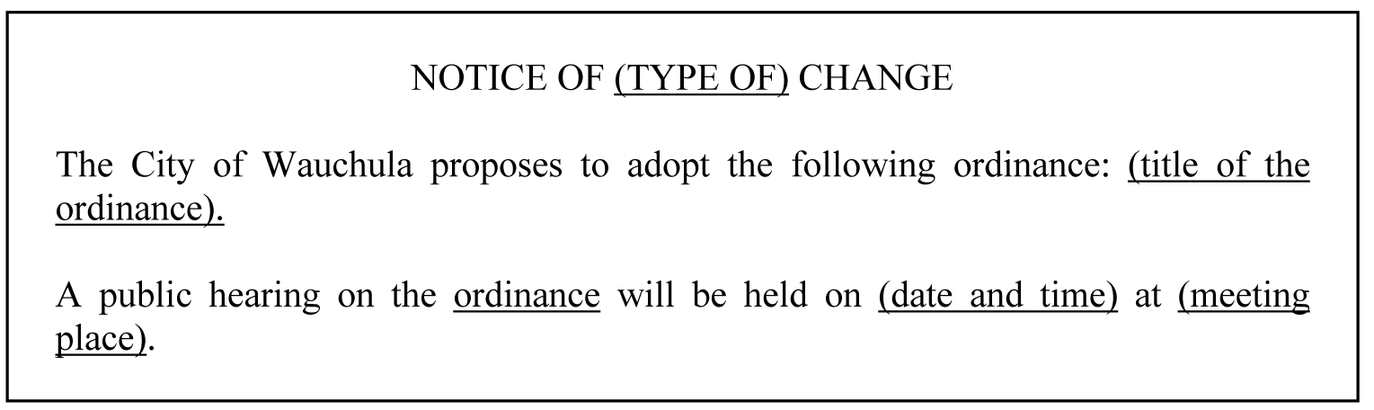 Public Notice Requirements: All procedures for advertisement of a public hearing to adopt an ordinance must be followed as adopted by the City and set forth in Section 8.06.00 above and in keeping with Florida Statutes Chapter 166. According to State Law, the following section (A) must be adhered to:
