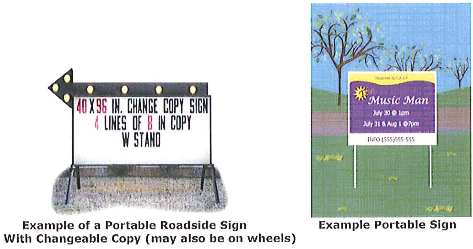 Sign, Portable: A sign that has no permanent attachment to a building or to the ground by means of a footing, including but not limited to, an A-frame sign, a sign with its own wheels designed to be pulled, a sign towed on a trailer or similar device, hot air or gas filled balloons, trash receptacles, and similar sidewalk appliances which display advertising copy and sidewalk signs.